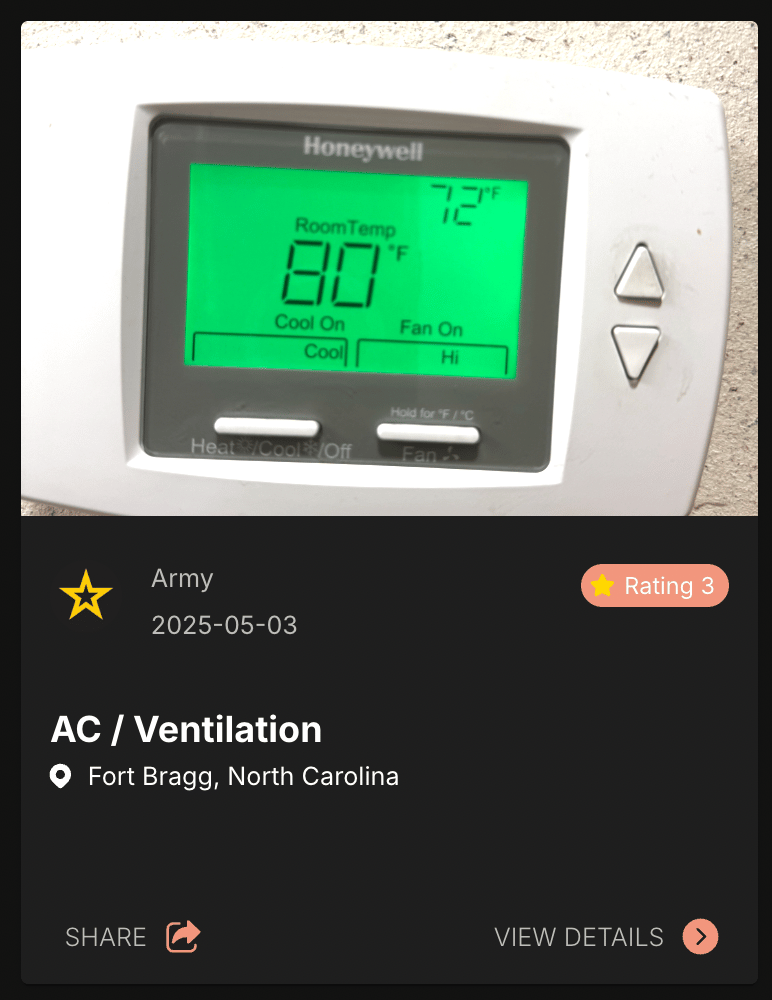 When reviewing a Cots (on-post barracks) experience in the app, you’ll now see an option to rate your DPW experience. Whether you had a smooth process or waited weeks for a work order to be addressed, your feedback helps build a clearer picture of what’s working and what’s not—installation by installation.